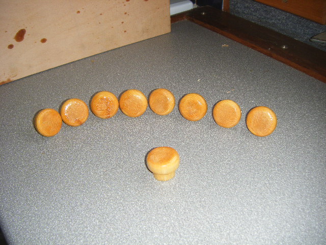 Having made the drawers I needed handles and looking on ebay they cost £2.50 each and I need at least eight. Found a piece of two by two, planed id down on the corners so that it was octagonal, put it on the lathe and made 12 handles in about an hour. Well pleased with my first attempt.