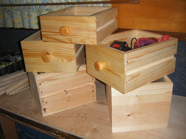 Made the frame and fitted drawers at the sides instead of the back. The frame was made with timber that I had hanging around, the top with the piece that my travelling companion had found and the drawers were made with surplus tounge and groove that Richard no longer wanted. I only had enough wood to make six drawers altogether, three each side but the space at the bottom is ideal to hold the kindling box and a couple of washing up bowls.