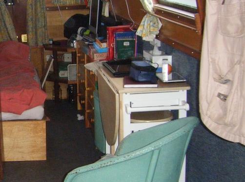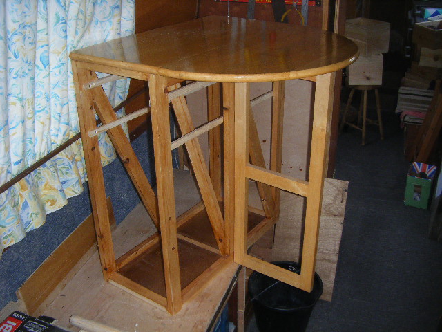 When I was on Almyne I had a small gate leg table with drawers to the opposite side to the folding top. I love it, but when I sold Almyne I let the table go with the boat as I thought that the table I had on Forty Two would suffice. As it turned out that table was just too big for me. After a lot of research I managed to source a new table in the same style as the old one but it was made of MDF and pretty soon was falling to pieces. Eventually I found a replacement, just like the original in a charity shop in Hinckley, which we had to carry through town, get it on the bus and then carry it from the bus stop to the boat, about three quarters of a mile alltogether. Fortunately another boater helped us carry the table along the tow path.